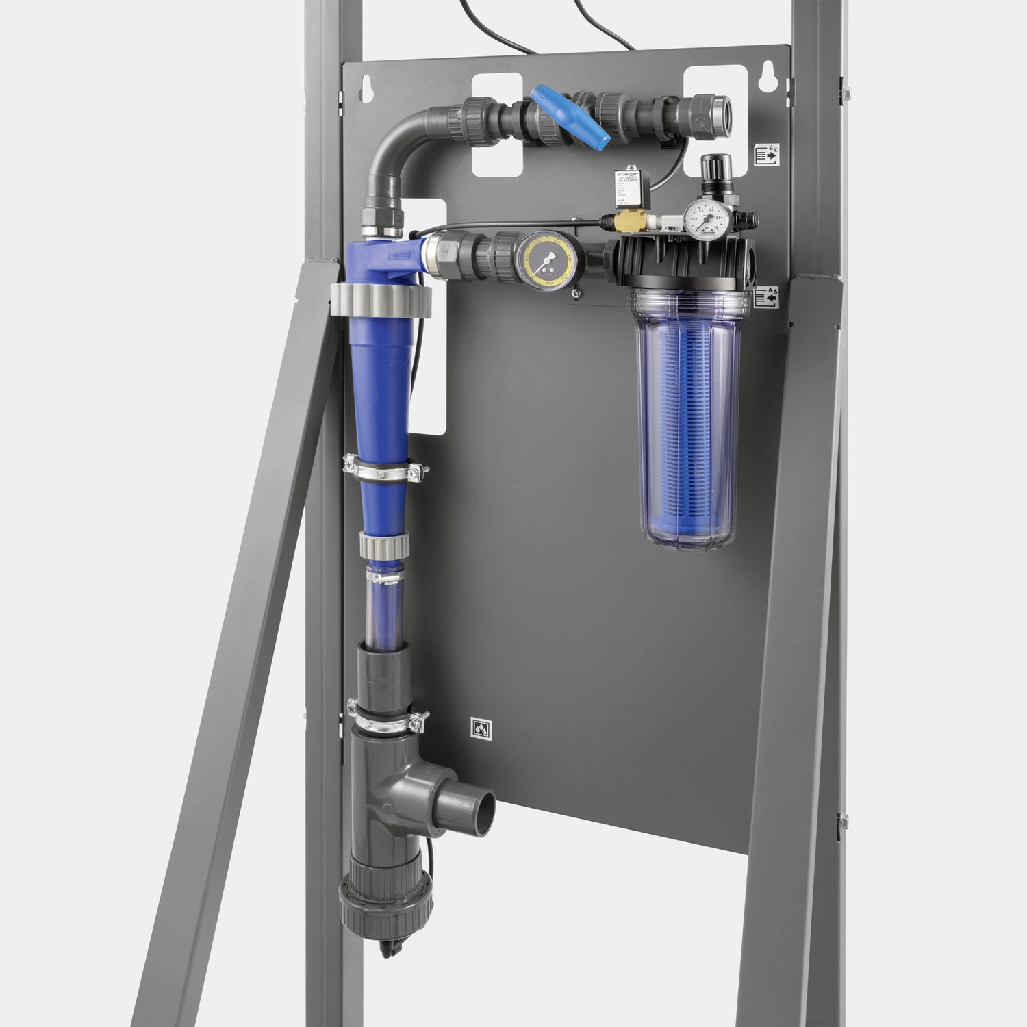 Karcher system recyrkulacji wody WRP Car Wash działa na zasadzie oczyszczania wody za pomocą hydrocyklonu, co pozwala na jej ponowne wykorzystanie podczas mycia pojazdów.