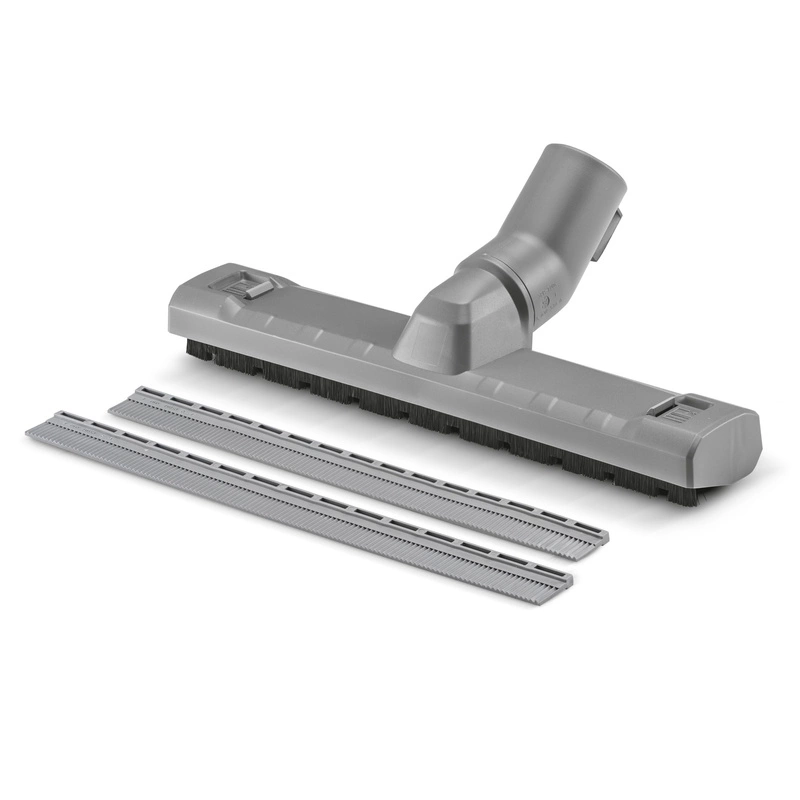 Do usuwania drobnego pyłu, grubych zanieczyszczeń oraz płynów za pomocą odkurzaczy uniwersalnych firmy Kärcher: ssawka podłogowa w rozmiarze DN 35 wykonana z wytrzymałego tworzywa sztucznego o szerokości 300 milimetrów z rolkami bocznymi. Zawiera również praktyczny hak do bezpiecznego odstawiania urządzenia. Listwy szczotkowe i ściągaczki można szybko i łatwo wymienić za pomocą klipsa.