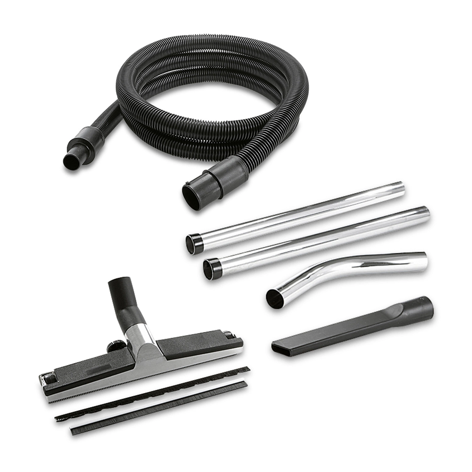 Zestaw Karcher ID 40 zawiera metalowe rury ssące, kolanka, ssawkę podłogową oraz ssawkę szczelinową, co pozwala na wszechstronne zastosowanie w budownictwie.