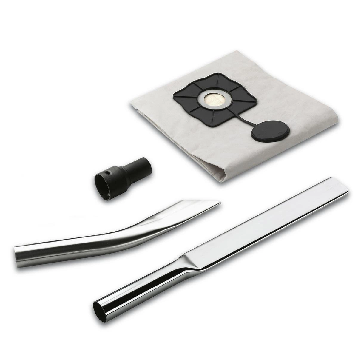 W skład zestawu wchodzą różnorodne akcesoria, w tym ssawki szczelinowe, które umożliwiają dotarcie do trudno dostępnych miejsc, oraz specjalne torebki filtracyjne.