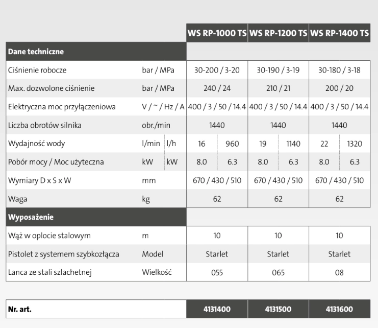 - Nazwa produktu: Myjka wysokociśnieniowa Kranzle WS RP-1600 TS